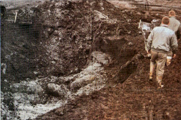 In 1948 when Mr Zeilemaker assisted a Alkmaar enterprise to excavate the wreckage, they found the bodies of three airmen still inside the cockpit. "We dug out the tail and mid-sections, but when we saw these corpses, we immediately stopped the excavation work and closed the hole. It wasn't until yesterday when the pit was opened again." He thinks there are still bombs inside the aircraft. The bomber was totallyconsumed by fire, and in the previous excavation of the tail and mid-sections bombs were never found.